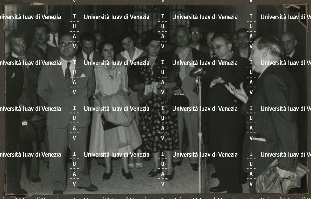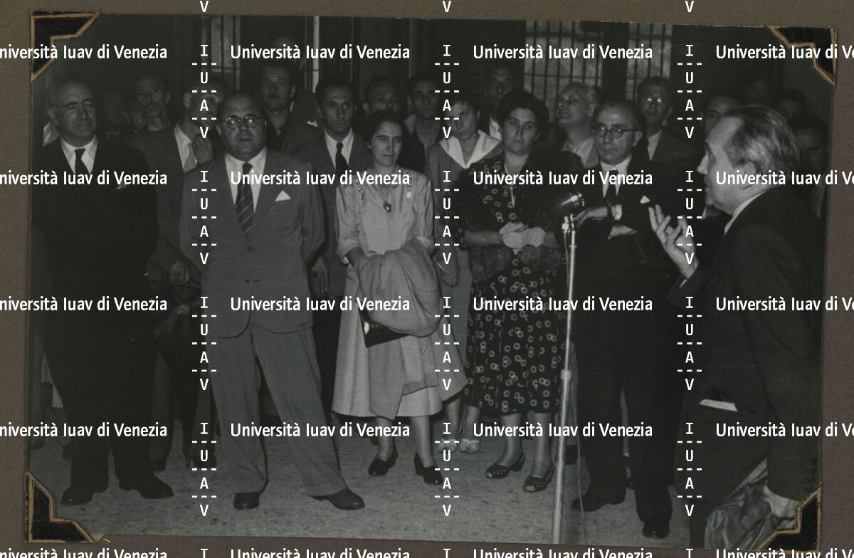 Visita a Venezia di Carmen Franco e del marito Cristóbal Martínez-Bordiú accompagnati da Ferdinando Forlati e altre persone, 1950. Foto Ferruzzi.