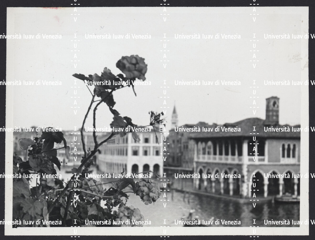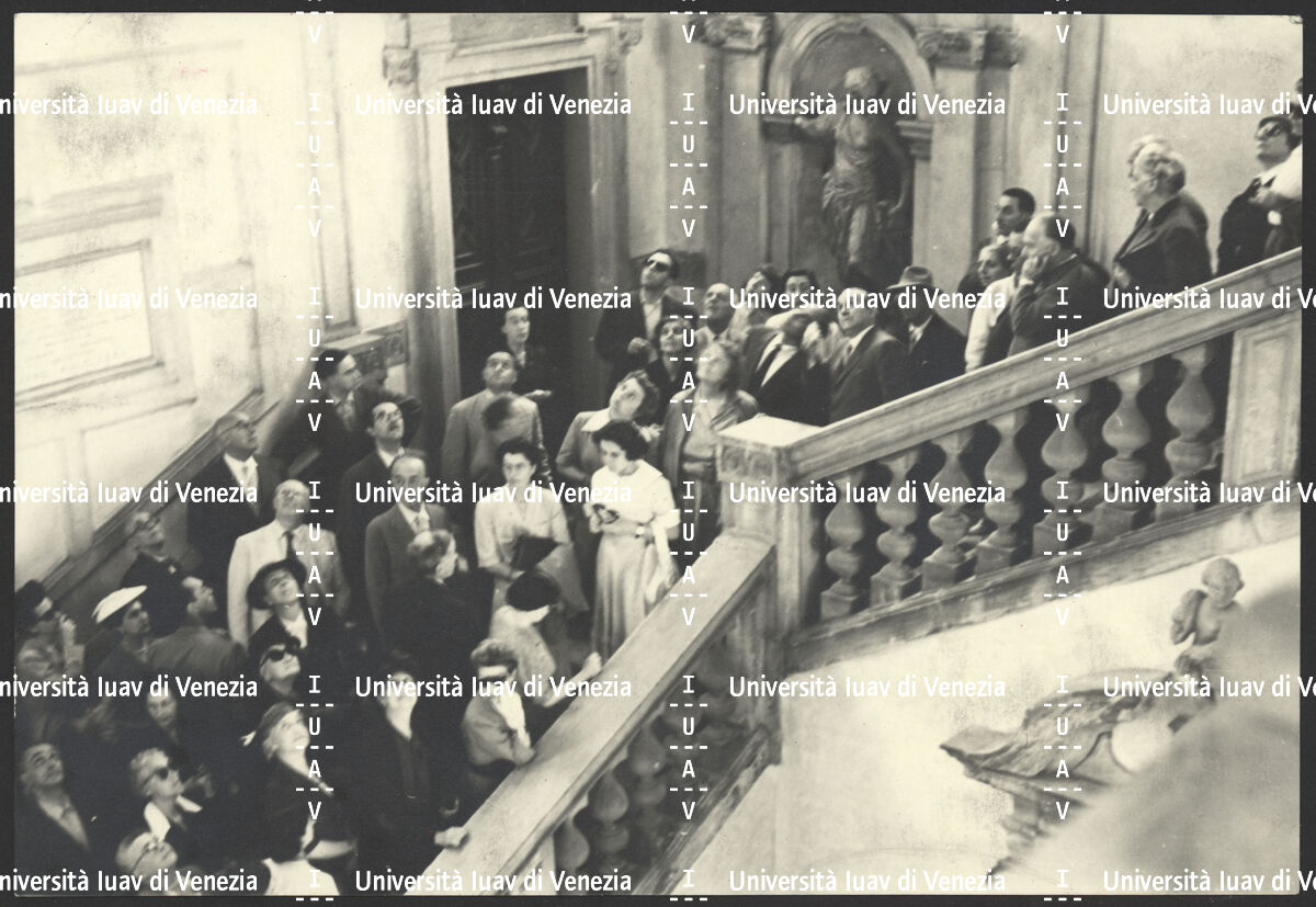 Ferdinando Forlati con un gruppo di persone sulla scalinata della Fondazione Cini all'Isola di San Giorgio, Venezia.