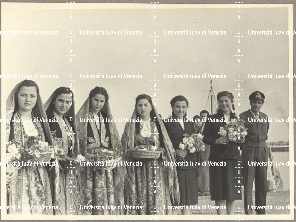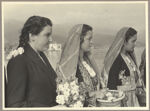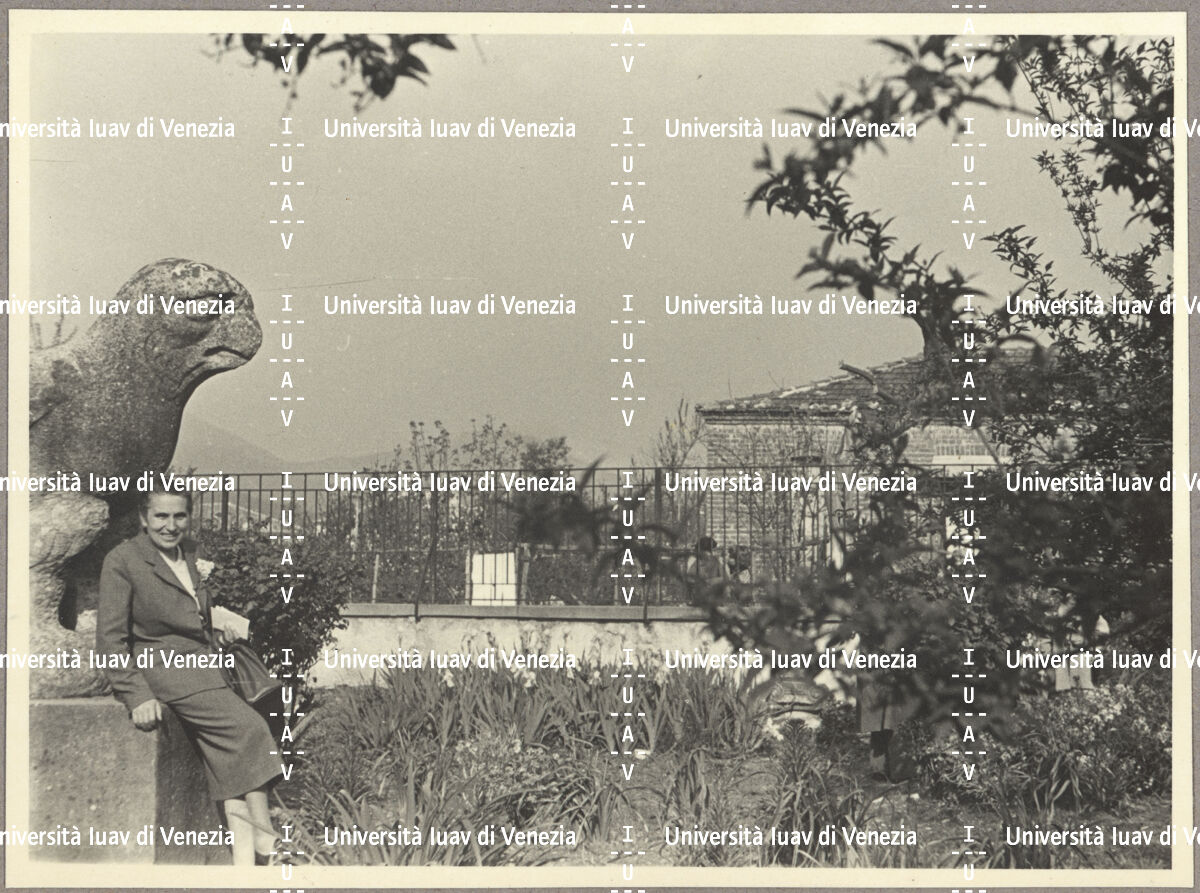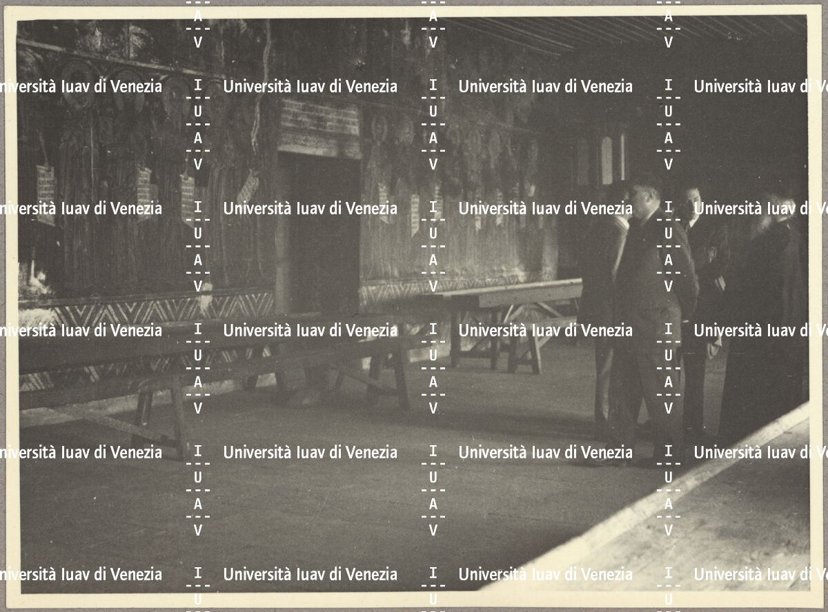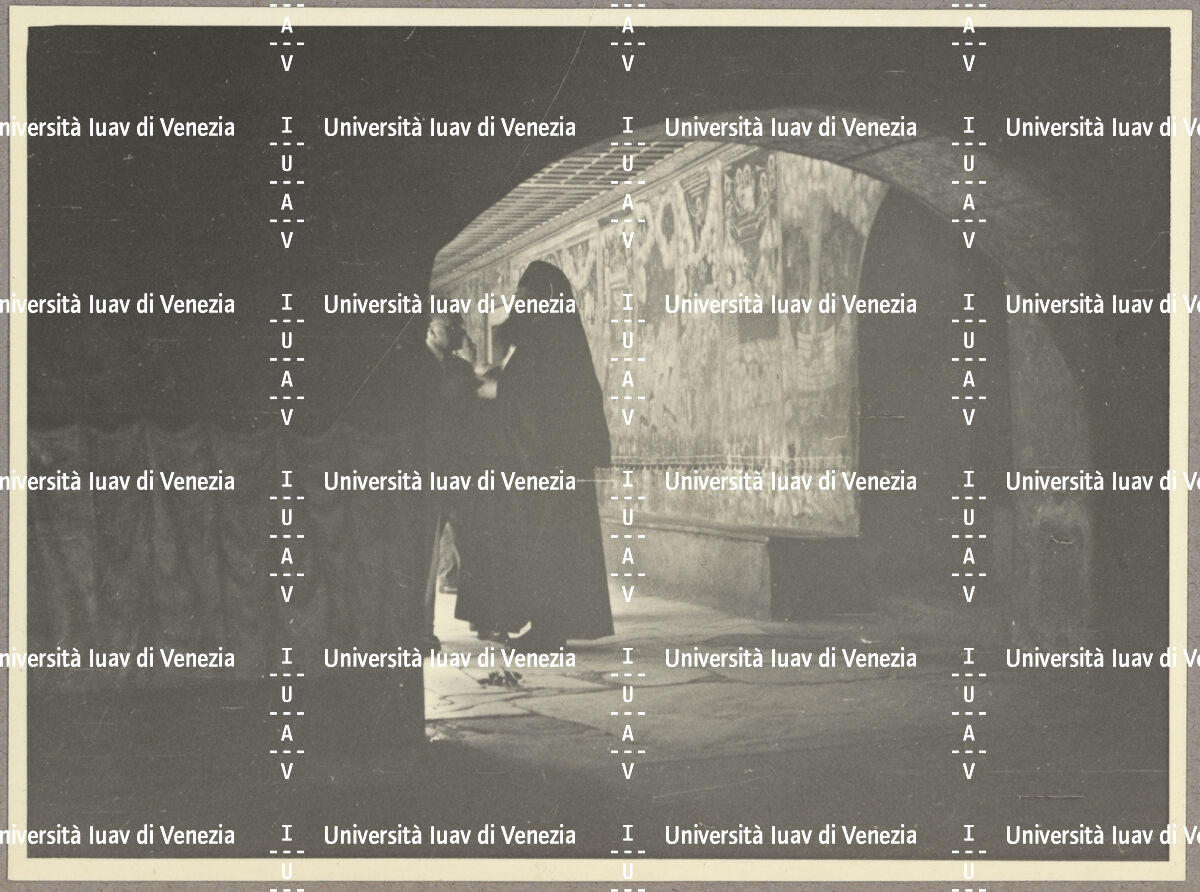 Ferdinando Forlati ritratto con due preti vicino a una chiesa.