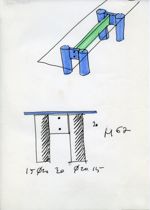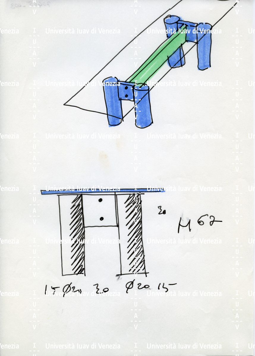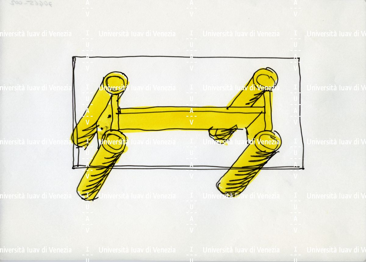 [Tavolo rettangolare con gambe cilindriche collegate da elemento centrale]
