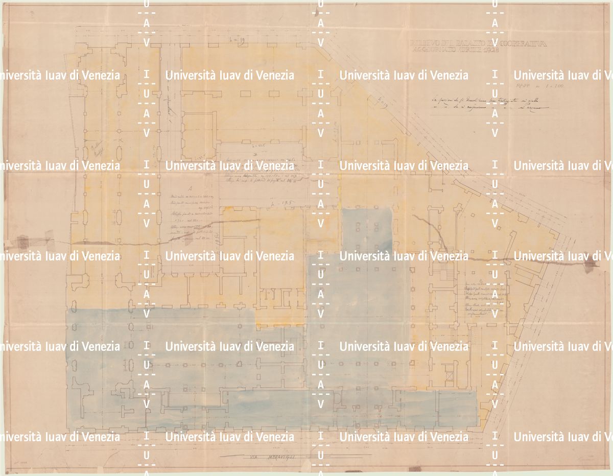 4. Dis. n. 2021 Rilievo ex Cooperativa aggiornato aprile 1928 - stracciata, con nota manoscritta: in giallo demolizioni, in azzurro conserva.