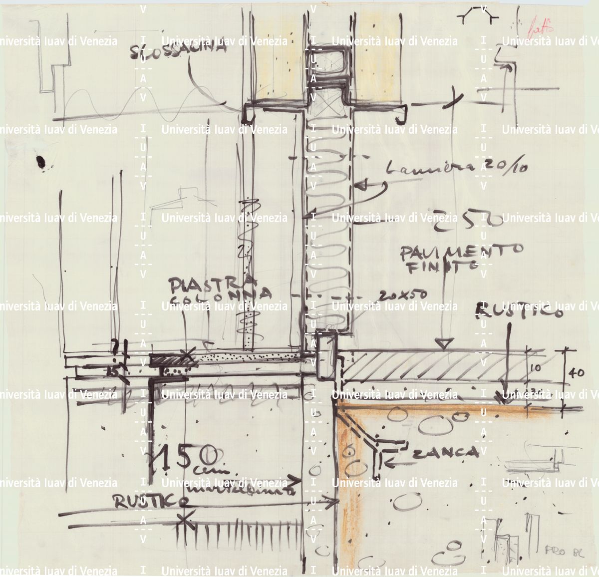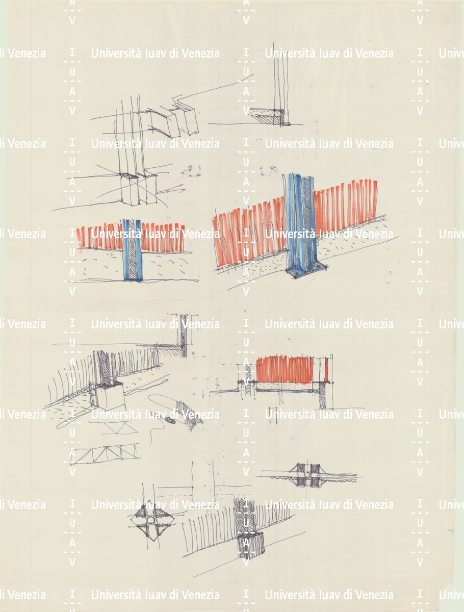 14 disegni di studio: dettagli costruttivi, dettagli scala, giunti, pilastri, attacchi alle colonne d'angolo, cappello in lamiera.