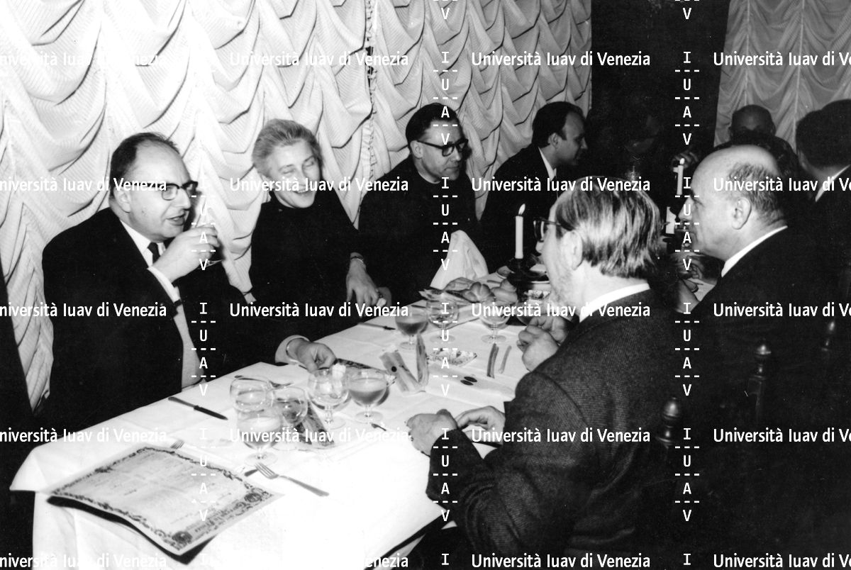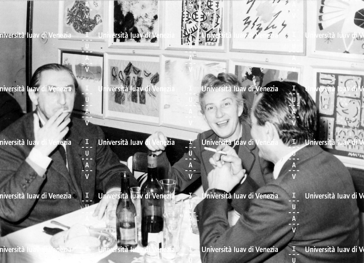 [Egle Renata Trincanato con Carlo Scarpa e altri amici al ristorante]