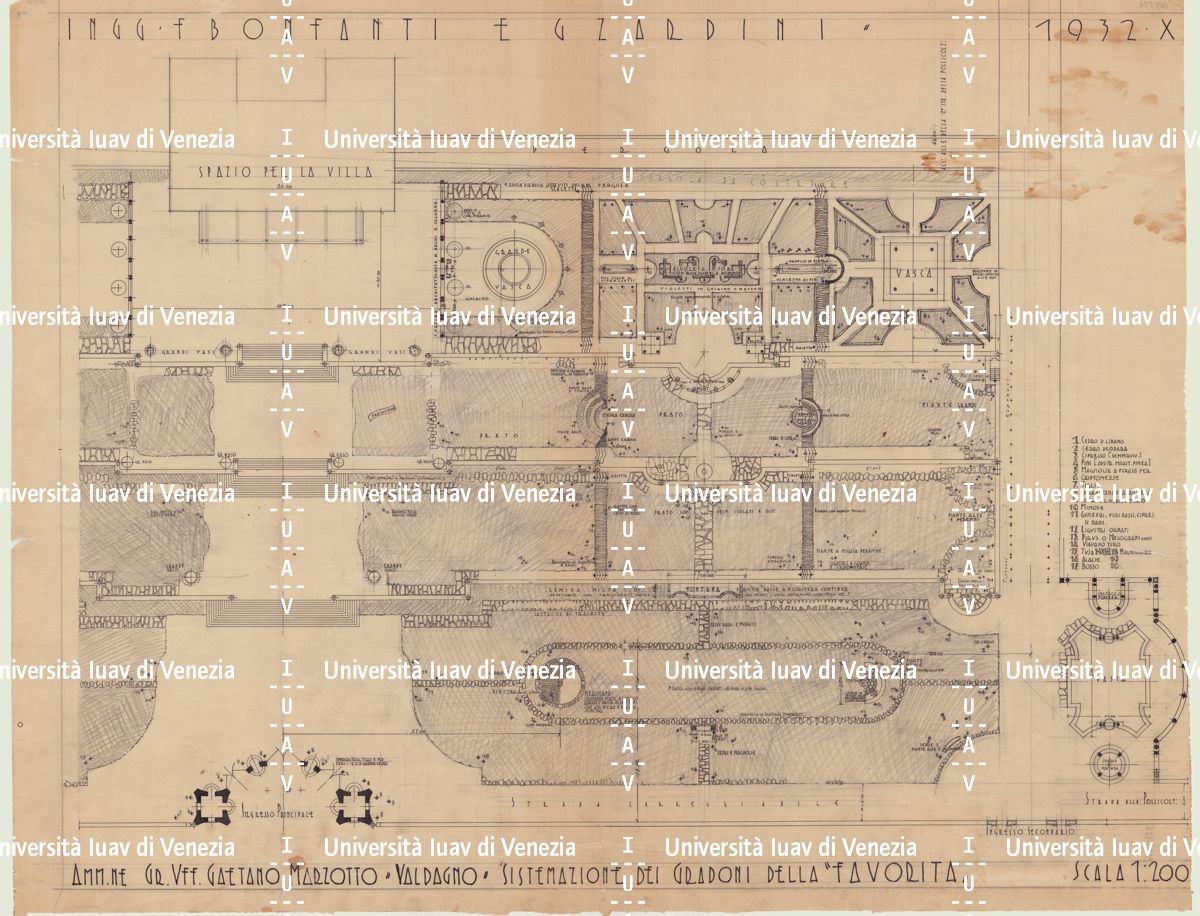 1. cartellina: 22 disegni di piante, sezioni, vedute e particolari dei gradoni, delle serre, del pergolato, del chiosco, delle coltivazioni e del sistema di irrigazione del giardino eseguiti ad inchiostro di china e matita su carta da lucido, carta e copie eliografiche e 4 carte di appunti sulle travi, 27 marzo 1930-1933.