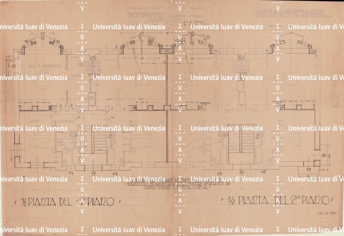 2. cartellina: 36 disegni soprattutto con piante delle case delle diverse tipologie previste dal progetto e con una planimetria generale eseguiti ad inchiostro di china su carta da lucido e 9 disegni in copia eliografica su carta in scala 1:1000 e 1:100 (formato prevalente 33 x 46 cm), 1929.