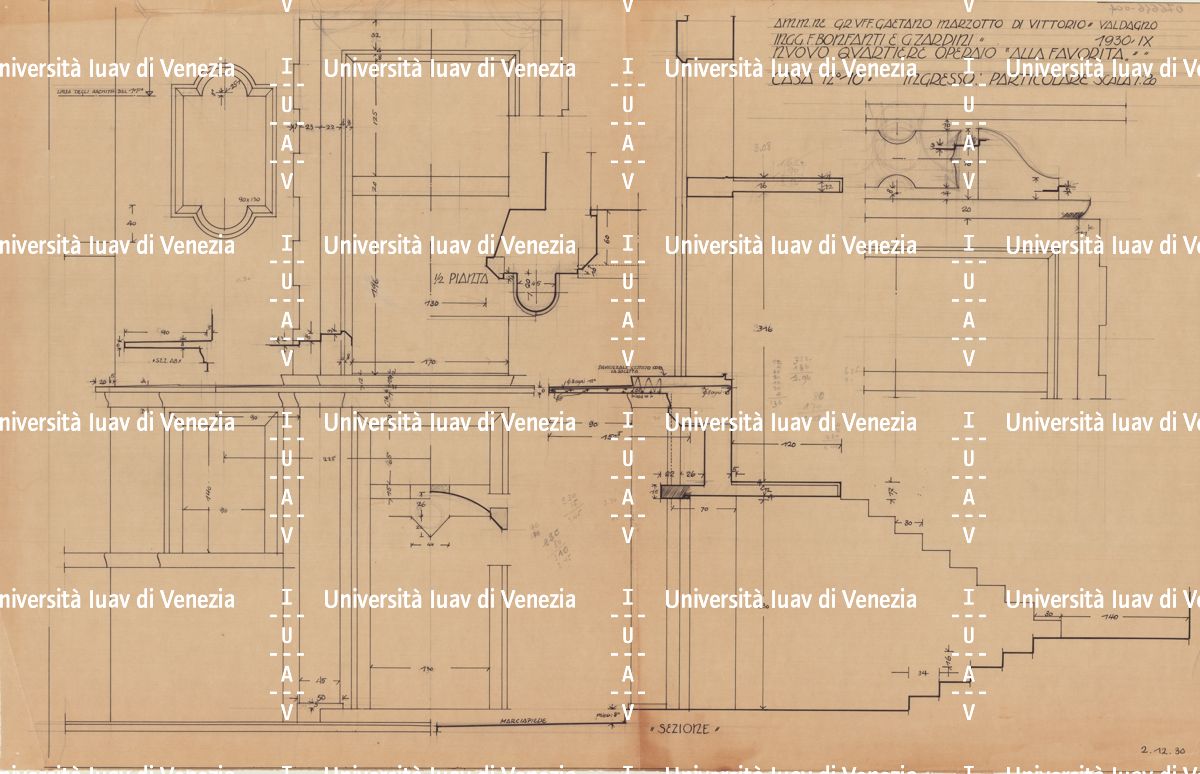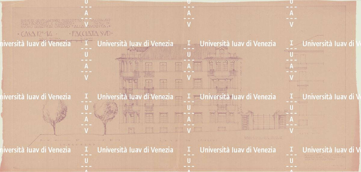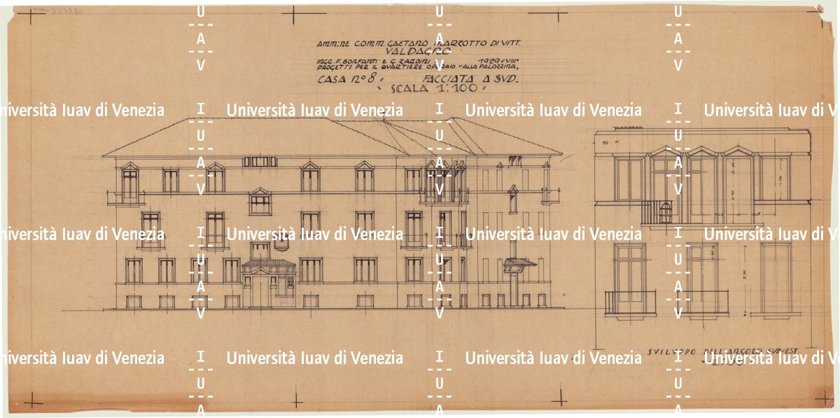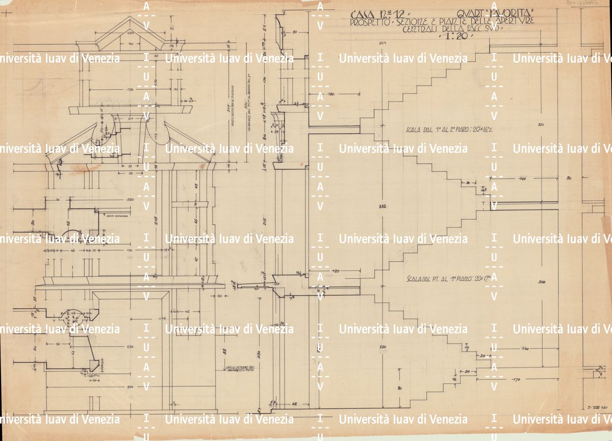 6. cartellina: 8 disegni con pianta, prospetto e particolare della casa n. 10 del quartiere "Alla Favorita" ad inchiostro di china su carta da lucido, due in copia su carta vegetale con ritocchi ad inchiostro ed uno in copia eliografica su carta in scala 1:50 e 1:20, 1929-30.