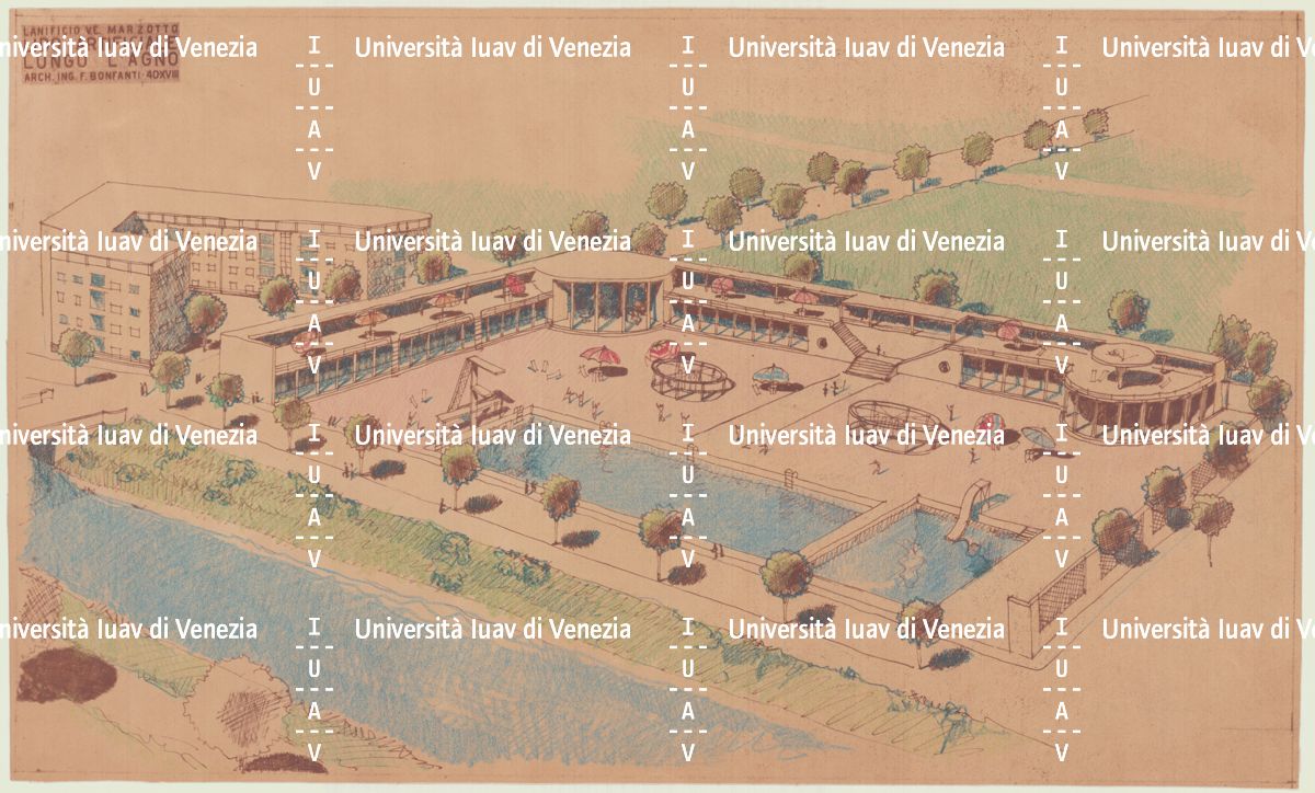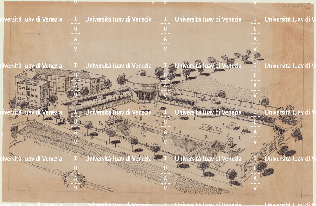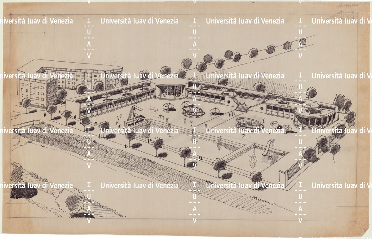 14. cartellina: 6 disegni con le vedute prospettiche di lido artificiale lungo il fiume Agno eseguiti ad inchiostro di china su carta da lucido ed in copia eliografica ritoccata con pastelli colorati e 2 disegni con la veduta assonometrica del nuovo quartiere al Ponte di Novale eseguiti ad inchiostro di china su carta da lucido (cartella 24).