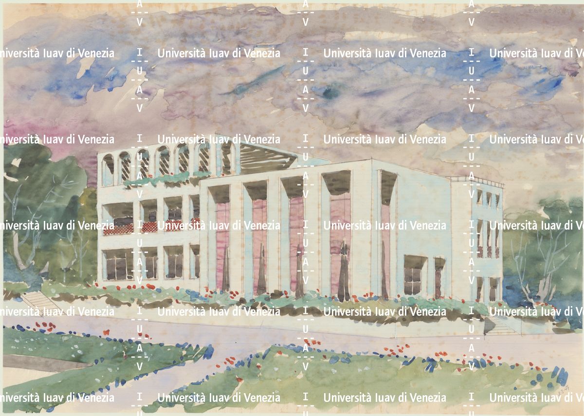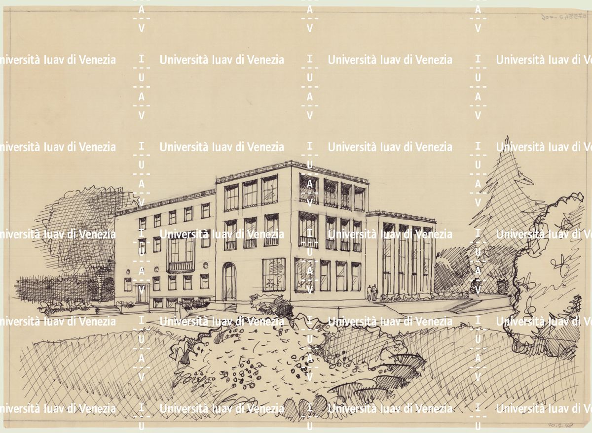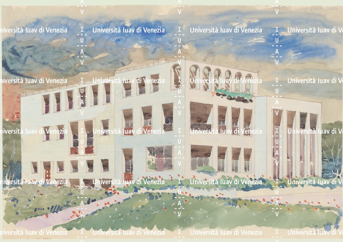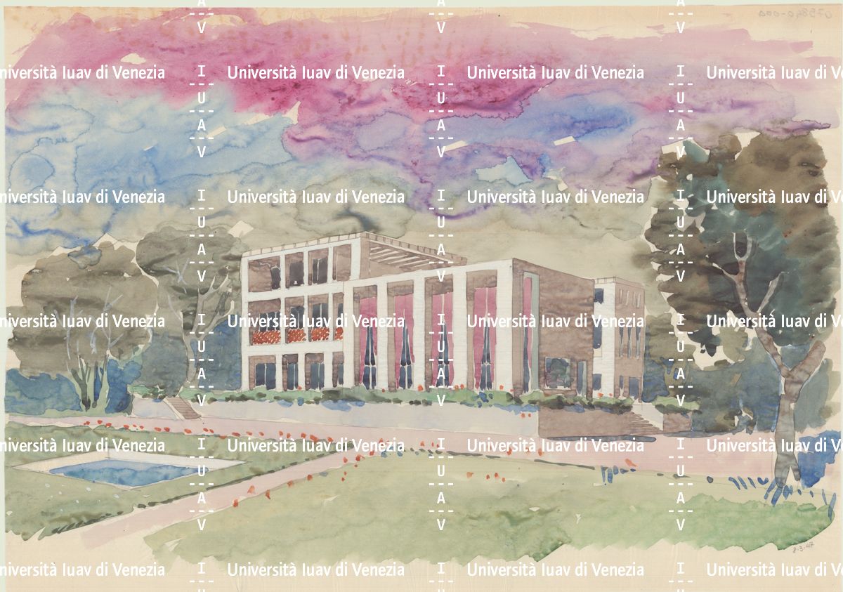 17. cartellina: vedute prospettiche di varie soluzioni, 4 disegni ad acquerello su carta (8 marzo 1947), 2 disegni a pastelli colorati su copia eliografica, 6 disegni ad inchiostro di china su carta da lucido, 20 febbraio 1948 (cartella 153).