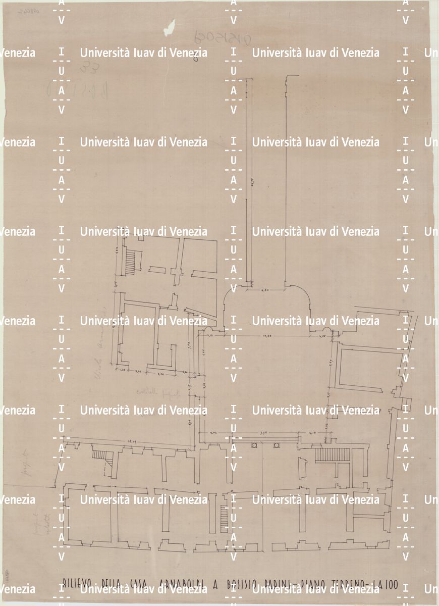 Rilievo della casa Arnaboldi a Bosisio Parini: piano terra. Inchiostro di china su carta da lucido, scala 1:100, 74 x 53 cm. Strappo in alto al centro.